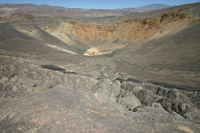 Auf der Rückfahrt zweigen wir noch zum Ubehebe Crater ab, einem gigantischen Vulkankrater, der bei einer Explosion vor rund 2000 Jahren entstanden ist. Wenn man vor dem gigantischen Loch des Kraters mit seinem Durchmesser von rund 800 m und der einer Tiefe von 150 m steht kann man sich gar nicht vorstellen, welch Explosionskraft hinter einer solchen Wucht stecken muss. Der kleine Nebenkrater, zu dem man noch rund 500m den Berg hinauf muss wirkt dagegen wie die Kindergartenversion.
