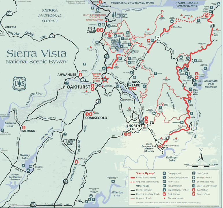 Der Sierra Vista Scenic Byway führt auf rund 85 mi / 140 km durch die Bergwelt des Sierra Vista National Forest, vorbei an Museen, dem Mittelpunkt von Kalifornien, Aussichtsplätzen über die Bergwelt und seinen Granitfelsen, die über Jahrtausende zu Domen geschliffen wurden.