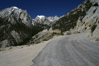 Im Westen von Lone Pine erhebt sich an der Grenze zum Sequoia NP der Mt. Whitney, der höchste Berg auf dem US-Amerikanischen Festland. Der Mt. Whitney ist 14.496 feet / 4418 m hoch und ist umgeben vom Sequoia NP, dem Inyo National Forest und der John Muir Wilderness Area. Da der Mt. Whitney von Lone Pine aus von anderen Bergen verdeckt ist muss man die schmale, kurvenreiche Whitney Portal Rd hochfahren. Von hier aus ist die Bergspitze einsehbar. Am Ende der befestigten Straße startet dann auch der Trail auf den Gipfel des Mt. Whitney (ca. 15km einfache Strecke, 1950m Höhenunterschied). Die Besteigung des Mt. Whitney ist, da über eine Wanderung erreichbar und keine Kletterausrüstung notwendig, sehr beliebt. Aus diesem Grund werden täglich nur 75 Permits ausgestellt, kostenlos erhältlich beim US Forest Service (P.O. Box 8, Lone Pine, CA 93545, Tel. 780 / 876-5542, weitere Infos gibts online) oder an der Ranger Station in Lone Pine (Whitney Rd., Öffnungszeiten von 7:00 bis 17:00 Uhr). Am Mt. Whitney Portal befindet sich ein Campground, ein Restaurant und ein kleiner Laden für die notwendigen Einkäufe der Camper. Schöne Aussicht auf den nahegelegenen Wasserfall. Das Mt. Whitney Portal ist ab dem ersten Schneefall, meist von Oktober bis Mai, geschlossen. Eine Karte vom Umkreis gibts hier (jpg, 11 MB), eine Trailbeschreibung und Tipps für die Besteigung des Mt. Whitney hier (pdf, 378kb).