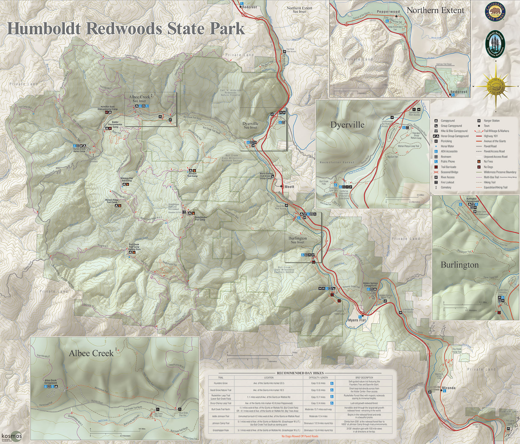 Eine Karte über die Campgrounds als pdf und eine Parkkarte als jpg gibts hier zum herunterladen, weitere Infos gibts online unter http://www.parks.ca.gov und http://www.humboldtredwoods.org.