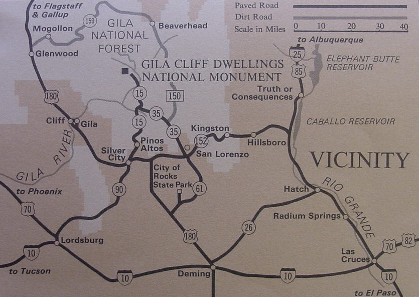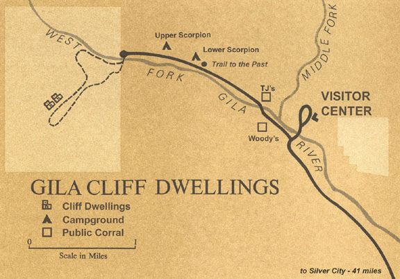 Von der Interstate 10 aus Las Cruces kommend in Deming über den US Hwy 180 bis Silver City, dort abbiegen auf Hwy 15 in Richtung Pinos Altos. Durch Pinos Altos durchfahren, Straße führt direkt bis zum Gila Cliff Dewllings NM.
