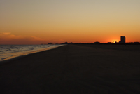 Wir machen einen Strandspaziergang zum Sonnenuntergang (und das zweite mal an dem Tag durchgefroren). Der Sand ist irgendwie merkwürdig, ganz fein und fest, als wäre es gar kein Sand sondern eher getrockneter Schlamm - ist aber feucht. Auf jeden Fall lässt es sich gut laufen, da man nicht immer so stark einsinkt.