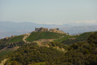 Hinter Santa Barbara zweigt der Hwy 154 über die Berge hinweg ab. Dem folgen wir, anstatt weiter an der Küste zu bleiben. Die Straße führt hinauf bis auf knapp 500 m Höhe, um nach dem Pass wieder auf eine Hochebene abzufallen. Hier besteht das Land aus Farmland, weite, gelbe Wiesen mit vereinzelten Bäumen, dazwischen immer Wieder Hügel und Felsen. Wir zweigen in Los Oliven ab zur Ne verland Ranch, der Farm von Michael Jackson. Doch wie erwartet sieht man nichts, die Ranch ist abgeschottet hinter Berghängen, nur das verschlossene Einfahrtstor ist ersichtlich - mit den entsprechenden Hiterlassenschaften seiner Fans. War eigentlich so zu erwarten, aber ein Versuch war´s Wert.