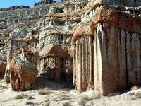 3. Tag: Los Angeles nach Lone Pine Frühmorgens um 7:30 Uhr verlassen wir das Motel und machen uns zu Fuss ( ! ) auf zum Denys, der sich auf dem Gelände des Motels befindet. Die Stärkung ist aber auch notwendig, da wir jetzt durch die Wüste in die entlegenen Gegenden von Kalifornien fahren und zu befürchten steht, dass bei einem Hungereinfall kein Mc Donalds zur Stärkung zur Hilfe eilen kann. Die Fahrt führt uns durch die Ebenen der Sierra Nevada und hinein in die Mojave Wüste. Die Hügel sind mit Gras bewachsen, dazwischen immer wieder Sandsteinfelsen unterschiedlicher Farbschattierungen. Dank einem Wasserkraftwerk, das unsere gesamte Aufmerksamkeit auf sich gezogen hat, haben wir auch unsere Ausfahrt verpasst und wir durften die gesamte Strecke wieder zurück fahren. Zum Glück "motzt" das Navi, wenn man vom rechten Weg abkommt. Die Mojave besticht mit seiner Kargheit und den kleinen Büschen, die den staubigen Boden bedecken. Am Horizont zeichnen sich noch Vulkankrater ab, ansonsten gibt es nicht viel zu sehen. In Mojave sind wir an einem Flugplatz vorbei gekommen, auf dem relativ große Flugzeuge gestanden haben. Auch hatten wir den Eindruck, dass hier Flugzeugteile herumliegen. Ob sich hier ein Flugzeugwerk befindet? Der Red Rock Canyon State Park besticht mit eindrucksvoller Erosion der unterschiedlichen Sandsteinformationen. Übrig bleiben Seulen, Canyons und Gebilde, die der Phantasie freien lauf lassen. Bekannt ist zum Beispiel der Camel Rock ...