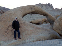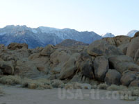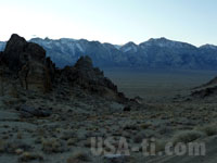 Die anschließende Fahrt über die Schotterpiste zum Little Lake Overlook wird für meine Mitfahrer zum Nervenkitzel, sind sie doch Fahrten abseits der geteerten Straßennicht gewöhnt. Hier werden wir noch echte Pionierarbeit leisten müssen. Auf jeden Fall gabs an dem Overlook ein Bier fuer die tapferen Mitfahrer, um die Nerven wieder etwas zu beruhigen. In Lone Pine angekommen schlagen die Herzen höher vor Begeisterung. Zugegeben, Lone Pine ist nicht unbedingt eine Stadt, in der was los ist, hat aber einen Western Flair erhalten. Richtig was los ist nur einmal im Jahr zu dem Maulesel Festival, wenn alle Menschen hier im Westernlook herumlaufen. Immerhin wurden hier in der Gegend eine Vielzahl von Western gedreht und die Portraits der Stars schmücken die Gänge der Motels und Wünde der Restaurants. Die Alabama Hills waren erwartungsgemäß ein Highlight, das die Herzen höher schlaen ließ. Ein letztes Bild zum Sonnenuntergang haben wir noch geschafft, leider geht die Sonne bereits um ca. 4 Uhr hinter den Bergen der Sierra Nevade, unter anderem mit dem Mt Whitney, dem höchsten Berg der USA, unter. Trotzdem bleibt es noch ausreichend hell, um sich die Wunder der Steinformationen in Ruhe anzuschauen.