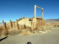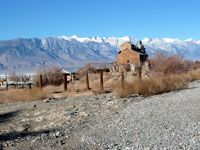 Auf der Fahrt entlang des ausgetrockneten Owens Lake habe ich auf einmal einen Schaufelraddampfer am Ufer liegend entdeckt. Selbstverständlich sind wir sofort umgedreht und durch das gottverlassene Kaff Keeler auf den schmalen "Dreck-Treck" abgebogen, der zu der Mine hinzuführen schien. Natürlich wogten die Begeisterungsstürme im Auto in und her, da meine Mitfahrer "begeisterte" Offroader sind (was bereits auf dem harmlosen Feldweg zum Little Lake Overlook einen Tag zuvor bewiesen wurde). Dabei war die Fahrt unkritisch, nur dass unser doch recht breites Auto links und rechts an den Wüstenbüschchen mit den harten Enden und Stacheln gerieben hat - die Krätzerchen lassen sich aber problemlos rauspolieren. An dem Schaufelraddampfer angekommen mussten ich aber feststellen, dass es sich eher um eine Rampf, Depot oder sonst was gehandelt hat und nur über die Entfernung wie ein Dampfer ausgesehen hat - ja, ein Versuch wars wert und der Weg ging wieder zurück auf die Straße.
