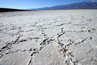 Weiter gehts nah Badwater, dem mit 85,5m unter Null tiefsten Punkt im Death Valley. Auch hier gehen wir auf der Salzspur hinaus, die ausssieht, als wäre der Boden vereist. Das Wasser ist hier komplett anders verdunstet und hat eine weiße Ebene hinterlassen, die aber keineswegs so glatt ist, wie die Salzebene bei Salt Lake City - hier ließen sich keine Geschwindigkeitsrekorde aufstellen. Wir sind auch nicht alleine, neben ein paar weiteren Autos hält dann auch ein Bus mit Chinesen - und schon ist es mit der Ruhe vorbei. In gewohnter Art udn Weise schnattert und brüllt das Folk die Stille davon, und wir machen uns auf den Weg zum nächsten Punkt und freuen uns, dass wir nicht in einer Bus (Tor) tour unterwegs sein müssen. Generell fällt auf, dass außer uns fast nur Chinesen oder andere Asiaten unterwegs sind.