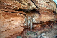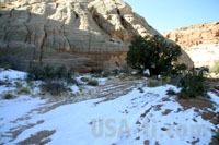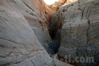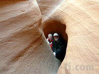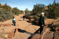 Der Weg führt entlang eines Washes, einem ausgetrockneten FLusslaufs. Der Boden ist sandig, was das Fortkommen anstrengend macht, hin und wieder verengt sich der Verlauf oder wir müssen einen kleinen Wasserfall hinauf klettern oder durch einen "Mini-Slotcanyon" durch kriechen. Alternativ gibt es meist einen Weg über die Böschung, um die Kletterei zu umgehen. Nach ca. 1,5 Meilen sollte eigentlich der Birthday Arch zu sehen sein, aber irgendwie ist weit und breit nichts von dem verflixten Ding zu sehen. Also gehen wir immer weiter bis wir im einen Tal an das Ende gelangen, ein Abschluss mit einem Wasserfall. Im anderen Tal finde ich einen kurzen, aber tief eingeschnittenen Slotcanyon, echt impossant aber noch immer kein Arch weit und breit. Unser Latein ist am Ende und wir kehren um - und da entdecken wir den Arch. Ich rase noch schnell den Sandhügel hinauf um noch ein paar Fotos zu schießen, meine Mitfahrer ziehen es vor, direkt weiter in Richtung Auto zu gehen.