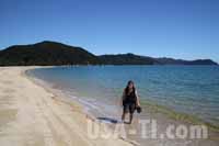 Auf dem Oberdeck im Freien schieße ich hunderte Bilder vom Hafen, der Stadt, der Mündung, den Inseln, den Bergen, der Küste und auf der Südinsel das selbe in umgekehrter Reihenfolge - war aber auch interessant. Die Fähre landet in Picton und wir fahren direkt weiter nach Nelson - mit dem neuen Auto, das nicht nur nicht quietscht sondern auch eine Klasse höher ist als bestellt. Und fährt auch gleich komfortaber ... Am Abend finden wir eine nette Kneipe am Hafen mit schöner Ausicht aufs Meer und genießen einen kleinen Happen. 12. Tag: Abel Tasman National Park und Fahrt nach Westport Nach einem kurzen Frühstück, wir haben unsmittlerweile an einen Tee mit Müsliriegel und einer Banane gewöhnt, machen wir uns auf zum Abel Taman National Park. Der Park ist ein Gebiet rund um einen wunderschönen Küstenabschnitt, bedeckt mit Regenwald und einer sagenhaften Steilküste mit vielen Felsen, dazwischen immer wieder tolle Buchten und Strände.