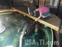 14. Tag: Von Hokitika über Franz Josef Glacier nach Haast Wir verlassen unser Motel um kurz nach 9:00 Uhr und fahren zum National Kiwi Center in der Stadtmitte. Neben Kiwis gibt es dort auch verschiedene Aquarienfische zu sehen und als weiteres Highlight die neuseeländischen Riesenaale. Die Fische sind anschauend und ansprechend in ihren kleinen Aquarien ausgestele, sind aber nichts aussergewöhnliches. 2riesige Glastanks beherrschen den Hauptraum: Im einen sind lauter kleine Fische, die wahrscheinlich auch als Futter genutzt werden. Der zweite Tank ist die Heimat von den Riesenallen, die alle zwischen 85 und 120 Jahre alt sind, teilweise weit über 1,5 Meter lang einen Durchmesser von mehr als 15cm haben. Um 10:00 Uhr sind wir bei der Fütterung dabei und nehmen da den aktiven Part ein, den Rießen in kleinen Portionen Rindergedärme und ähnliches zu geben.
