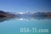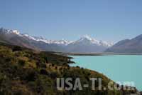 Der Mt Cook erhebt sich am Ende des Lake Pukaki und der anschließenden, von Gletschern frei geräumten Talsole. Der lake Pukaki erstreckt sich über zig Kilometer in einem hellen, seichten blau, das allerdings bei näherer Betrachtung nicht über kristalklares Wasser und dem entsprechenden Untergrund herrührt sondern aus im Wasser gelösten Sedimenten. Das Waser erscheint wie milchig, nur eben in dem hellen blauen Farbton.