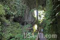 Wir halten an einem kurzen Walk durch den Busch zu einer Natural Bridge. Natürlich haben wir so ein kleines Ding erwartet, wo wir uns hinerher fragen, ob die 10 Minuten Wegzeit wirklich gut inverstiert war. Doch bereits der Weg durch Dschungel enlang eines Bächens ist ein Erlebnis, geht es auf Stegen und Hängebrücken immer tiefer in den Wald hinein. Und Hinten erwartet uns eine Natural Bridge von solchem Ausmaß, dass ich mir gewünscht hätte, mein Weitwinkelobjektiv mitgenommen zu haben - aber das liegt natürlich gut verstaut im Auto.