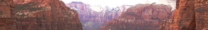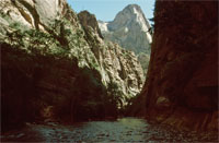 Die ersten Mormonenpioniere, die im 19. Jahrhundert die Gegend des heutigen Zion NP durchquerten, sahen das Tal des Virgin Rivers, das vom Hochplateau Uthas seinen Weg zur Wüste tief in eine Schlucht gegraben hat, in die selbst im Sommer kaum ein Sonnnenstrahl eindringt. Wo der Canyon breiter wird, mäandert der Fluss um steil aufragende, teilweise senkrechte Steilklippen, die sich auf über 1.000 m über dem Tal erheben, wie mächtige Säulen und tiefe Nischen. Die Mormonen sahen darin den natürlichen Tempel Gottes und benannten den Canyon nach der Himmelsstadt: Little Zion.